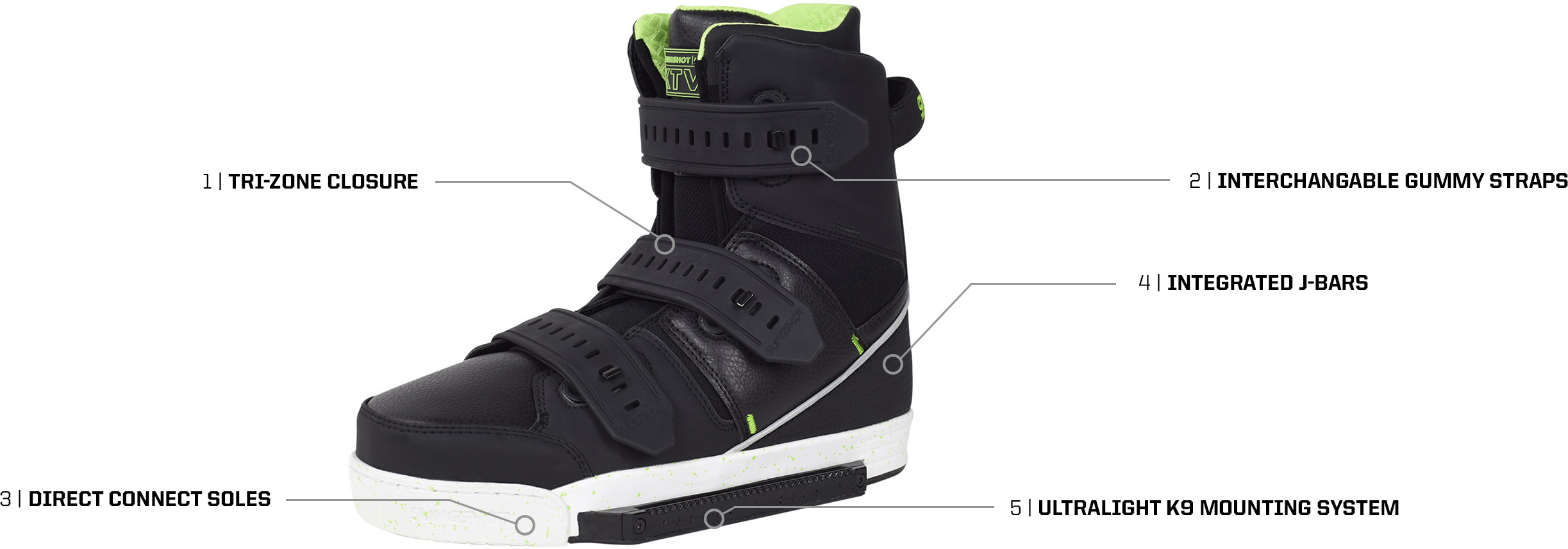 Der KTV ist ein High-Performance-Boot und konzentriert sich dabei so konsequent auf das Wesentliche, dass du es einfach nur genießen wirst, ihn endlich an deinen Füßen tragen zu können. Durch die Gummy Straps bist du im Moment eines Augenaufschlags rein- oder rausgeschlüpft und bekommst zugleich ein absolut simples und zugleich beispiellos intelligentes, wie funktionales Verschlusssystem geboten, das so manch altgedientem Wakeboarder schon Tränen der Freude in die Augen getrieben hat. Und um dem Ganzen noch die Krone aufzusetzen, hast du die Möglichkeit deine Boots mit Straps in unterschiedlichsten Farben zu individualisieren. Ein zweiter Satz in abweichender Farbe ist im Lieferumfang bereits enthalten. Noch Fragen? Na dann, ab aufs Wasser damit!