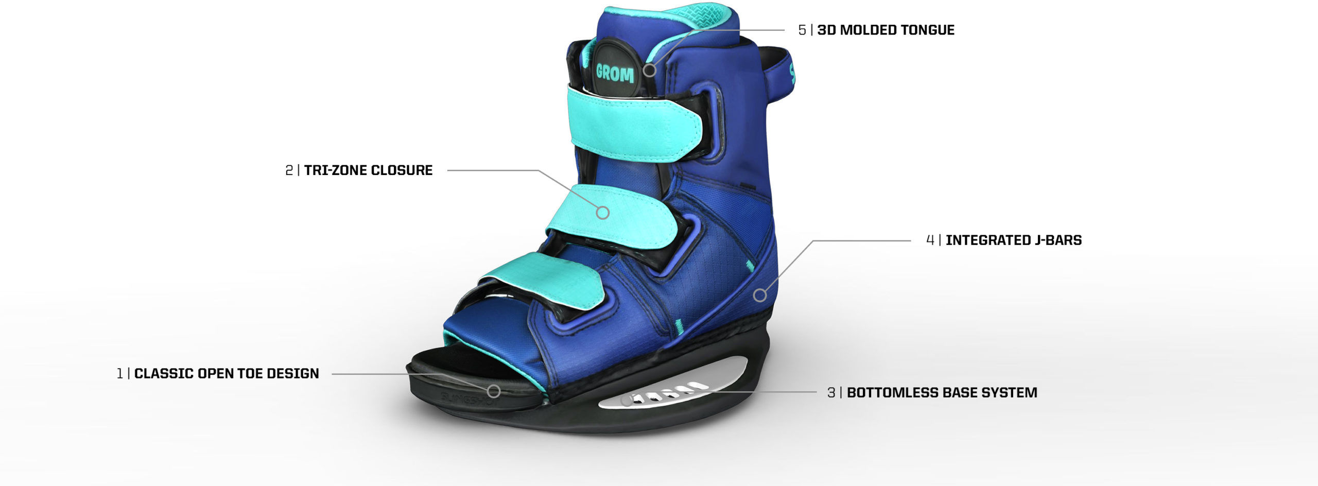 Der Grom-Boot verbindet High-End-Design mit perfekter Funktionalität für Einsteiger und einem sensationellen Preis-Leistungsverhältnis. Zudem kann er dank des Open-Toe-Konzepts von mehreren Fahrern geteilt werden, die eine ähnliche Schuhgröße haben. Die Bottomless-Baseplate bietet jungen Rippern ein herausragendes Gefühl für ihr Board, während der aus einer 3D-Mould kommende Innenschuh höchsten Tragekomfort garantiert. Auf unsere High-Tech-Materialien und die Performance des Grom vertrauend, können wir mit gutem Gewissen behaupten, dass es lediglich einen Grund gibt, um diesen Boot zu ersetzen. Nämlich dann, wenn die Füße zu groß geworden sind.