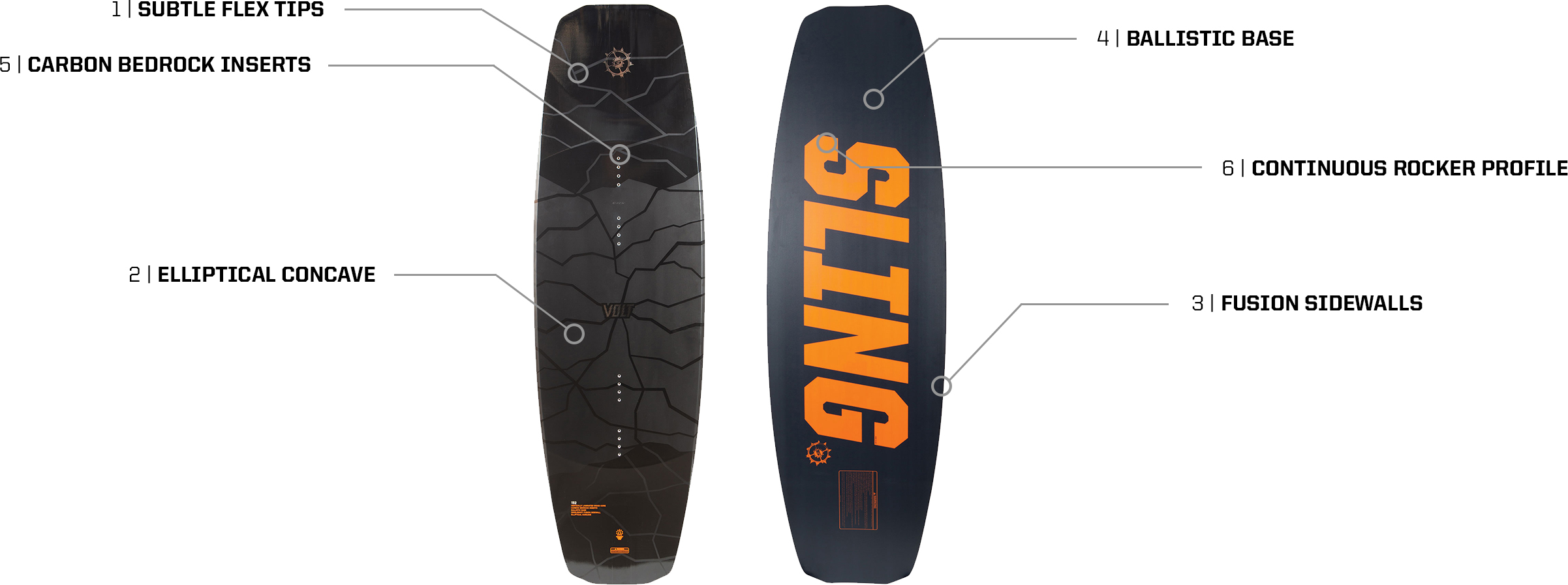Leicht, flexibel und extrem haltbar. Die Inserts bei allen Slingshot-Wakeboards sitzen auf einer Carbon-Base. So kann das Gewicht des Boards reduziert und die Zugfestigkeit der Inserts erhöht werden. Zudem beeinflussen die Inserts das Flexverhalten des Rumpfes im Gegensatz zu herkömmlichen Konstruktionen nicht negativ.