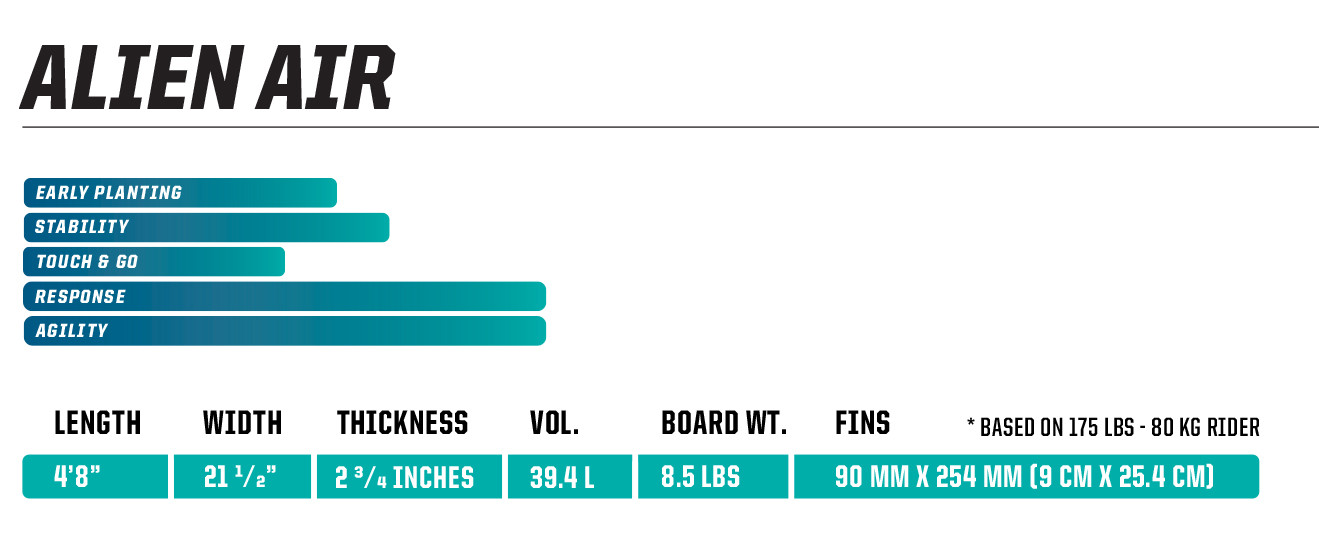 Auch 2019 setzen wir auf den bewährten wie vielseitigen Shape des Alien Air. Es begleitet dich bei deinen ersten Schwebeversuchen genauso wie der ersten durchgeglittenen Halse. Einfachstes Handling und höchsten Komfort für Foiler aller Könnensstufen bieten der breite Rumpf und der hohe Auftrieb. Das Alien Air ist ein wahres Allround-Foilboard.