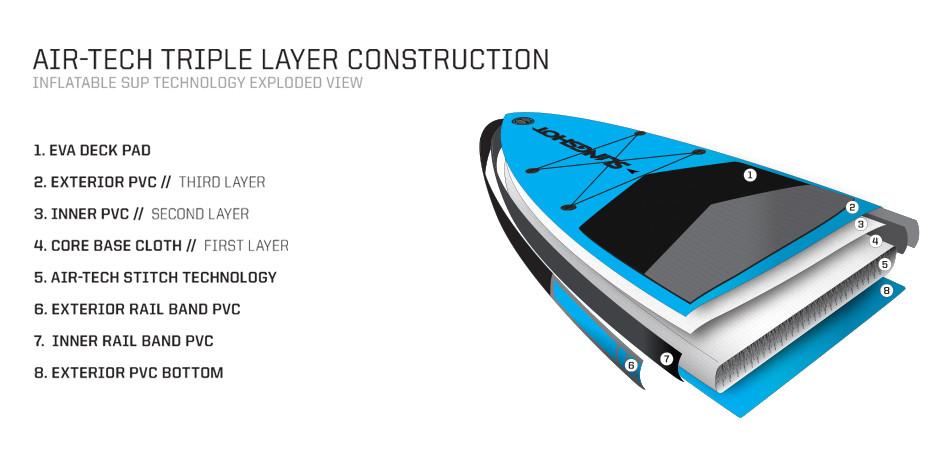Dank unserer Triple-Ply Konstruktion ist es gelungen ein unglaublich leichtes und strapazierfähiges SUP-Board zu entwickeln. Diese Innovation bietet erstmals die Möglichkeit ein Inflatable mit 15-18 PSi aufzupumpen und eine Festigkeit wie ein normales Hardboard zu erreichen. Die Zeiten von „zu weichen“ Boards sind endlich vorbei!