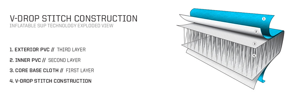 Die V-Drop Stitch Konstruktion ist der Schlüssel für die hohe Strapazierfähigkeit und ausgesprochen gute Performance unserer Inflatables. Die verwendete Innennaht ermöglicht einen höhren Druck der dem Board seine Struktur, Festigkeit und Shape verleiht.