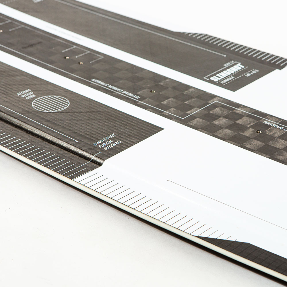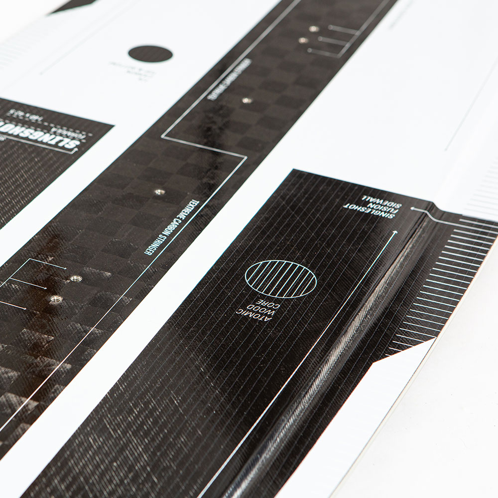 Ein im leistungsoptimierten 30-Grad-Winkel ausgerichtetes Carbongewebe umschließt den Holzkern. Um dem Ganzen die Krone aufzusetzen, verlaufen mittig entlang der Längsachse auf Deck- und Bottom-Seite zusätzliche Textreme-Carbon-Stringer. So realisiert das Formula V.1 Pop-Werte, die ihresgleichen suchen.