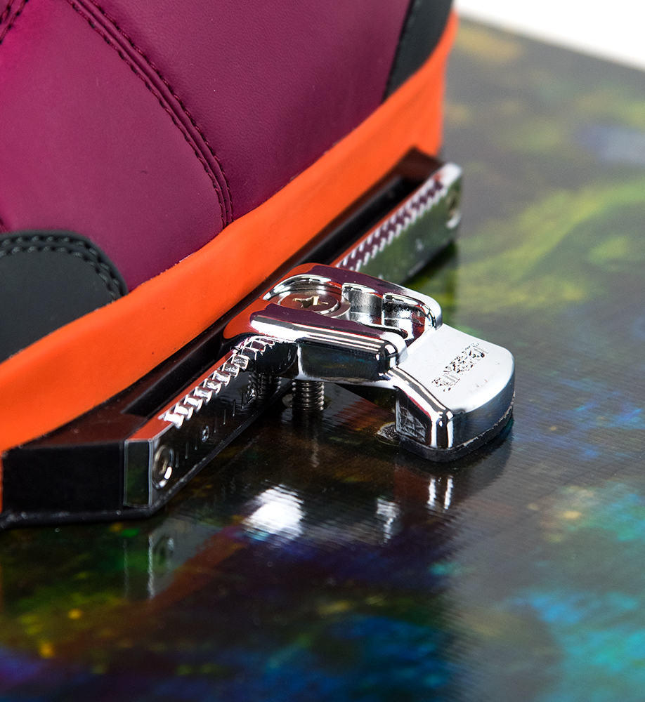Für 2017 führt Slingshot sein neues K9 Mounting System ein, für eine festere Verbindung zum Board, die ein Anheben deiner Ferse oder Zehen vom Board effektiv vermeidet. Eine komplett anpassbare Befestigung erlaubt dir jeden Stance, genauso wie du ihn möchtest. Eine steife Leiste ist an der Bindung befestigt und wird durch eine Klemme auf’s Board gepresst. Robuster geht es nicht!
