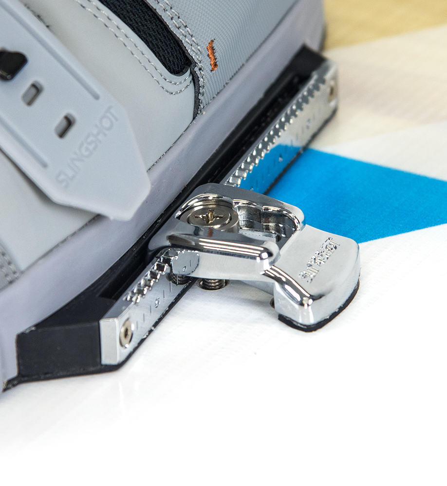 Für 2017 führt Slingshot sein neues K9 Mounting System ein, für eine festere Verbindung zum Board, die ein Anheben deiner Ferse oder Zehen vom Board effektiv vermeidet. Eine komplett anpassbare Befestigung erlaubt dir jeden Stance, genauso wie du ihn möchtest. Eine steife Leiste ist an der Bindung befestigt und wird durch eine Klemme auf’s Board gepresst. Robuster geht es nicht!