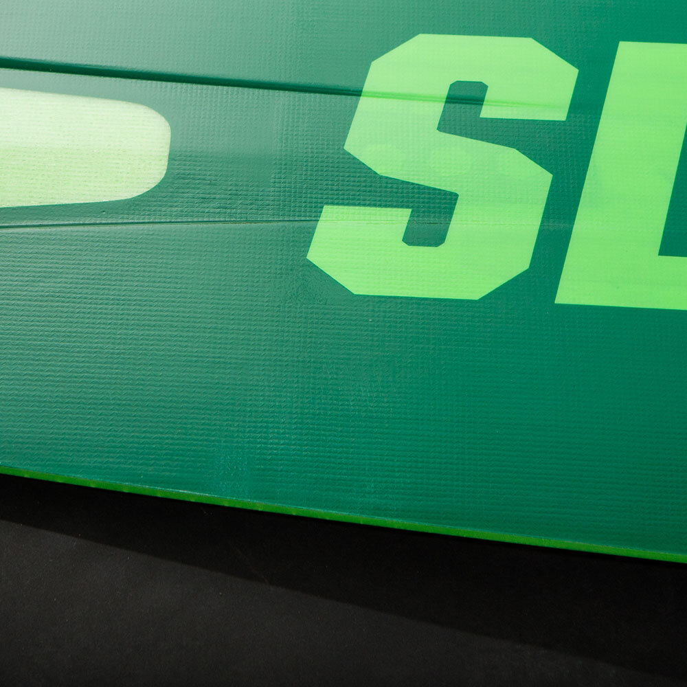 Nein, bei den leuchtend grünen Einsätzen in den Tips handelt es sich nicht um Kryptonit, auch wenn die Eigenschaften von Koroyd eine ähnlich faszinierende Wirkung entfalten wie das fiktive Mineral aus dem DC-Universum. Diese innovativen Einsätze erlauben eine differenziertere Flexgestaltung an den Boardenden, was den Komfort steigert und das Schwunggewicht reduziert.