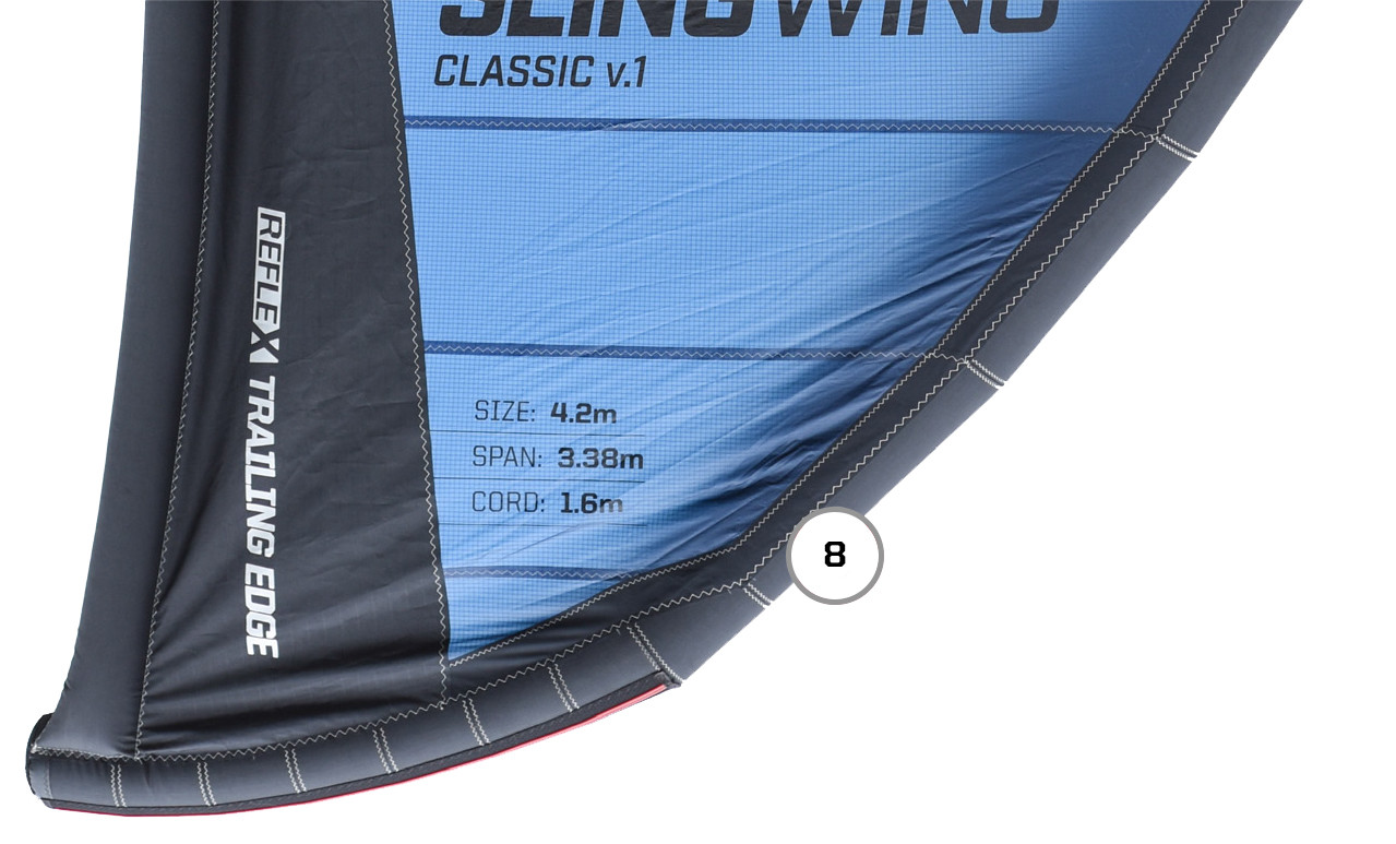 Dieses Detail spielt insbesondere für all jene eine entscheidende Rolle, die den Slingwing auf dem Skate- oder Snowboard einsetzen wollen. In den Tipbereichen ist die Strut mit extra abriebfesten Patches versehen, damit es nicht zu gravierenden Schäden kommt, wenn der Wing über den Boden geschliffen wird.