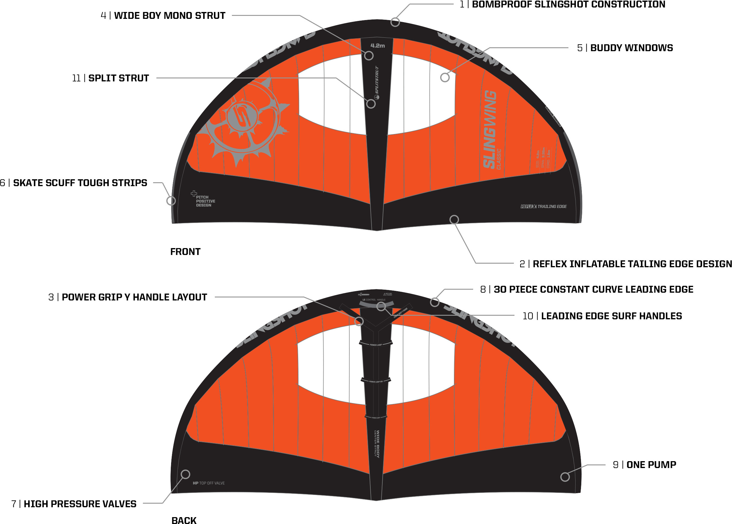 Das einzigartige Design des Slingwing basiert nicht zuletzt auf der aufblasbaren Abströmkante. Im Gegensatz zu Wings mit lediglich einer aufblasbaren Anströmkante verfügt der Slingwing über eine sehr steife Segelstruktur, was sich in Form von gesteigerter Performance und einer besseren Rückmeldung niederschlägt. Zudem unterbindet dieses Feature lästiges Flattern des Segels.