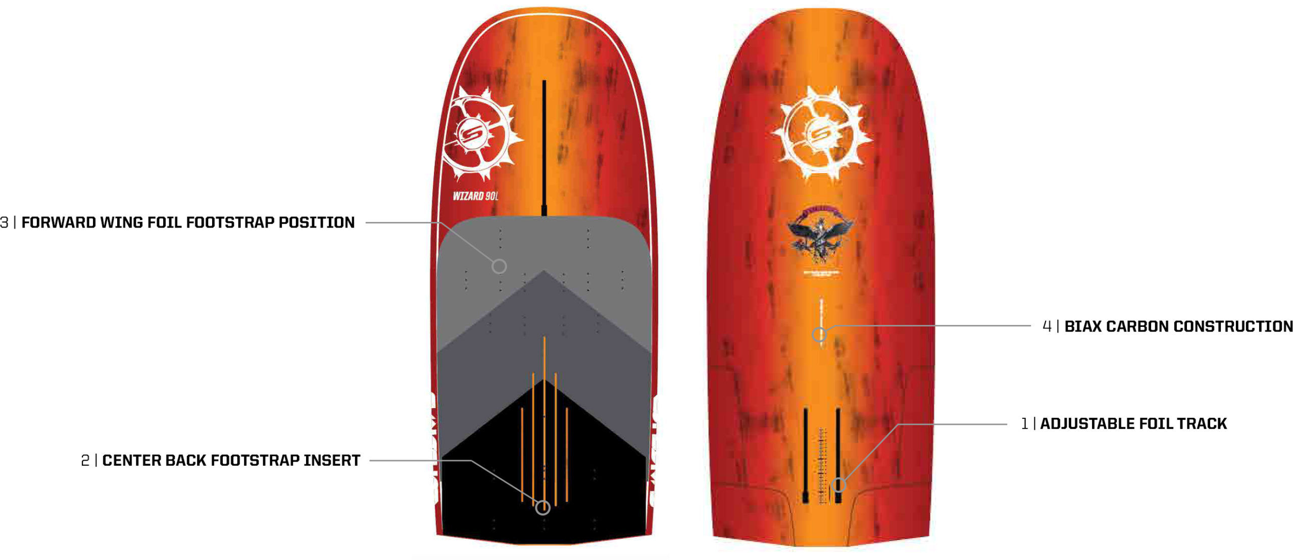 Das flinkeste Board der brandneuen Wizard-Range besitzt 90 Liter Volumen bei einer Länge von 147 Zentimetern und ist damit eine hervorragende Lösung wenn du auch bei stärkerem Wind Windsurffoilen willst, oder ein echtes Leichtgewicht bist. Die Outboard-Schlaufenpositionen für vorne und hinten liefern beste Voraussetzungen für irrwitzige Tack-Radien und eine herausragende Kontrolle bei hoher Fahrgeschwindigkeit. Dagegen sorgen die zentral entlang der Längsachse verlaufenden Insert-Reihen vorne und hinten für eine derart präzise Handhabung, dass du bei hohen Sprüngen das Gefühl haben wirst eins zu sein mit deinem Board. Durch die neue Schienenaufnahme im Unterboden kannst du deine Foilposition je nach Disziplin und Bedingungen genau so anpassen, dass du deine Lieblingsposition für die Fußschlaufen nie wieder verändern musst. Drei Jahre haben wir an diesem Board gearbeitet. Herausgekommen ist der wahr gewordene Traum eines jeden Foilers!